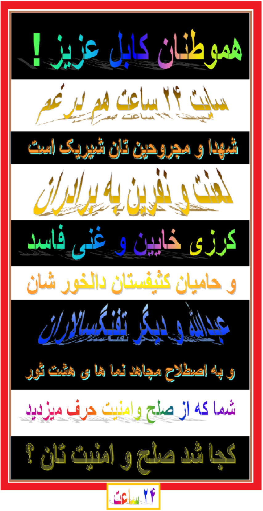 ۲۴ساعت نشریه انترنتی مستقل بوده و به هیچ یک از گروهها و سازمانهای سیاسی در داخل و خارج کشورارتباط نداشته و هدف آن خدمت به تمام مردم کشور عزیز و دوستداشتنی ما افغانستان بوده و است و بدون هر نوع عقده های شخصی ، تعصبات زبانی، مذهبی ، قومی ، منطقوی و نژادی، در مقابل هرنوع بی عدالتی ها ، ظلم ، جرم و جنایت مبارزه نموده وبه کمک هموطنان عزیز ، فرهنگیان وقلم به دستان گرامی در این راه به پیش خواهد رفت.