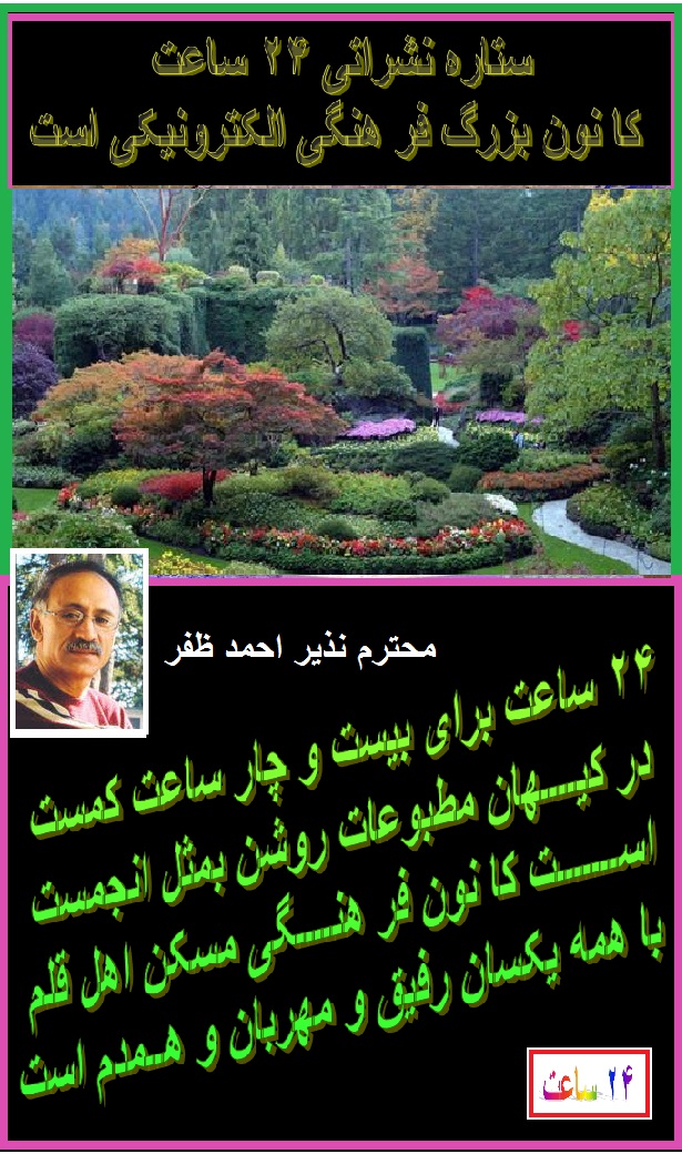 با اظهار تمنیات بیکران ؛ اکنون که در نهمین سالروز سایت وزین ۲۴ ساعت قرار داریم صمیمانه ترین تبریکات خویش را بمناسبت این روزخجسته ، به مدیرمسئول آن جناب مهدی جان بشیر، وهمکاران تخنیکی شان . وبه تمام خواننده گان عزیز آن به عرض رسانیده ، سلامتی و پیروزی تان را خواهانم .