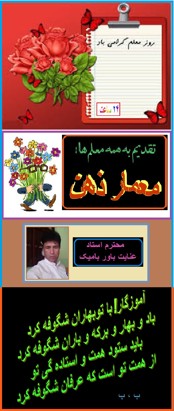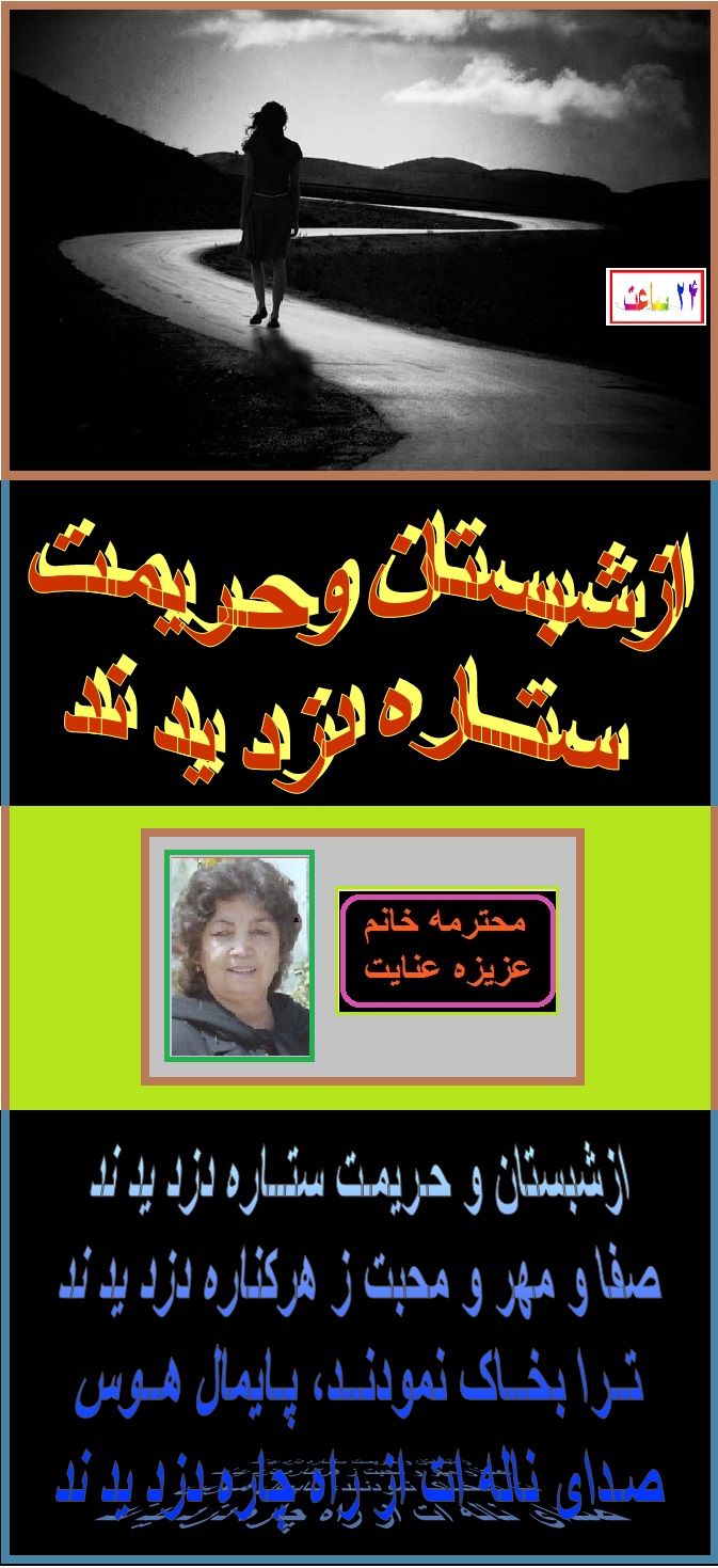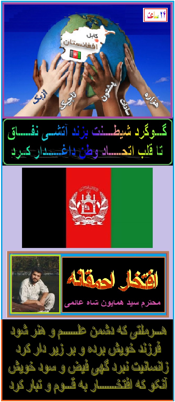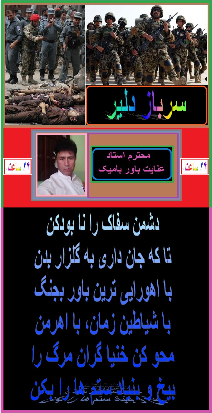 « تشکر از محترم استاد عنایت الله باور بامیک. شاعران عزیزیکه نظر و انتقادی داشته باشند میتوانند بنویسند. موفق وسلامت باشید. مهدی بشیر » موضوع خیلی جالب است ، از تمام شاعران عزیز و همکاران سایت ۲۴ ساعت میخواهم که حتمآ در باره این دیدګاه و آن نوشته نظریات ، انتقادات و پیشنهادات سالم خودرا با رعایت عفت کلام وقلم بنویسند . سایت ۲۴ ساعت در خدمت شان است .