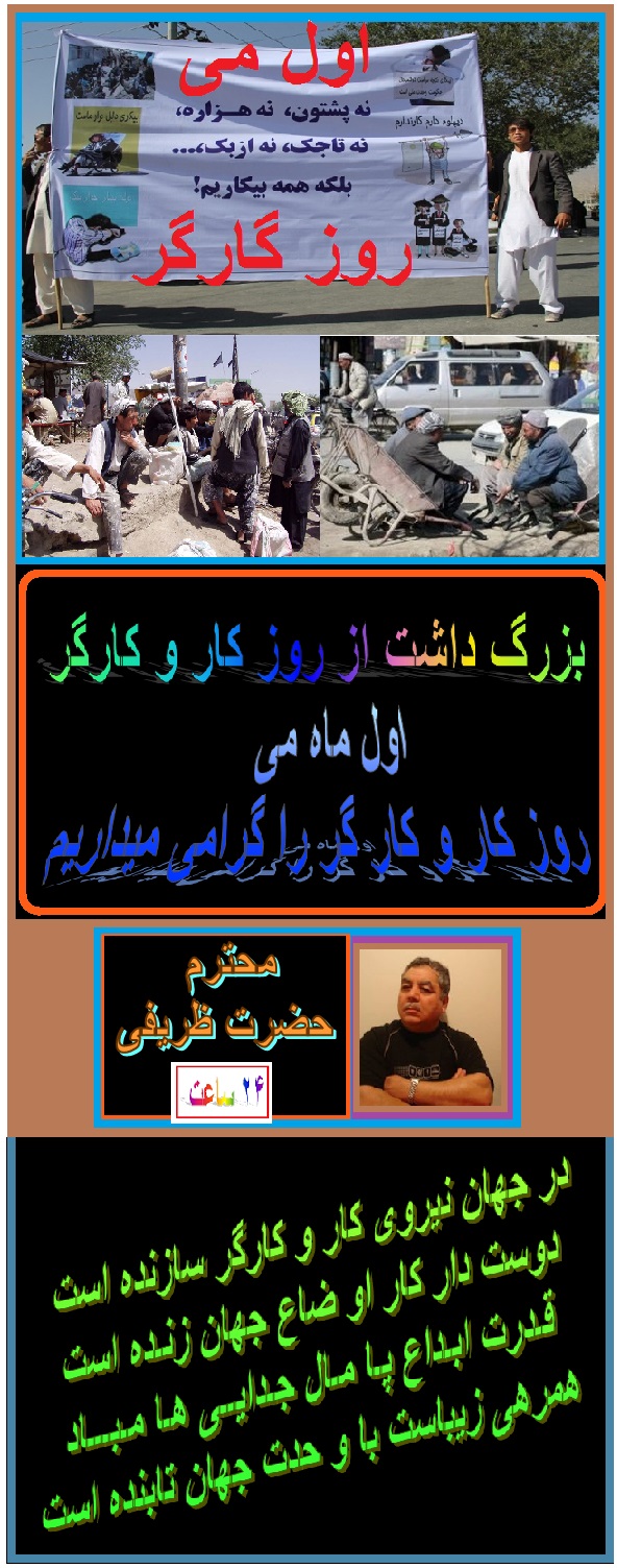 امروز دوشنبه اول می 2017 برابر است به رو ز جهانی کارگر ، من این روز را به تمام کارگران افغان و جهان تبریک عرض میکنم. امیدوارم که دولت خواب رفته و فاسد وحشت ملی فکری به حال جوانان و کارگران بیکار کشور ما بنماید و دالر های باد آورده شده را عوض اینکه به بانک های خارج ذخیره نماید و یا مصرف جنایتکاران و برادران خلف و نا خلف خود کند که تازه به کشور دعوت نموده است و به آنها قصر و پایگاه بسازند ، بهتر است از آن پول ها ی بی زبان چند تا فابریکه بسازند تا مردم ما از بیکاری و آواره گی نجات یابند و لقمه نان حلالی به خانه خود ببرند و با فامیل خود صرف نمایند. از جناب آقای حضرت ظریفی جهانی سپاس.