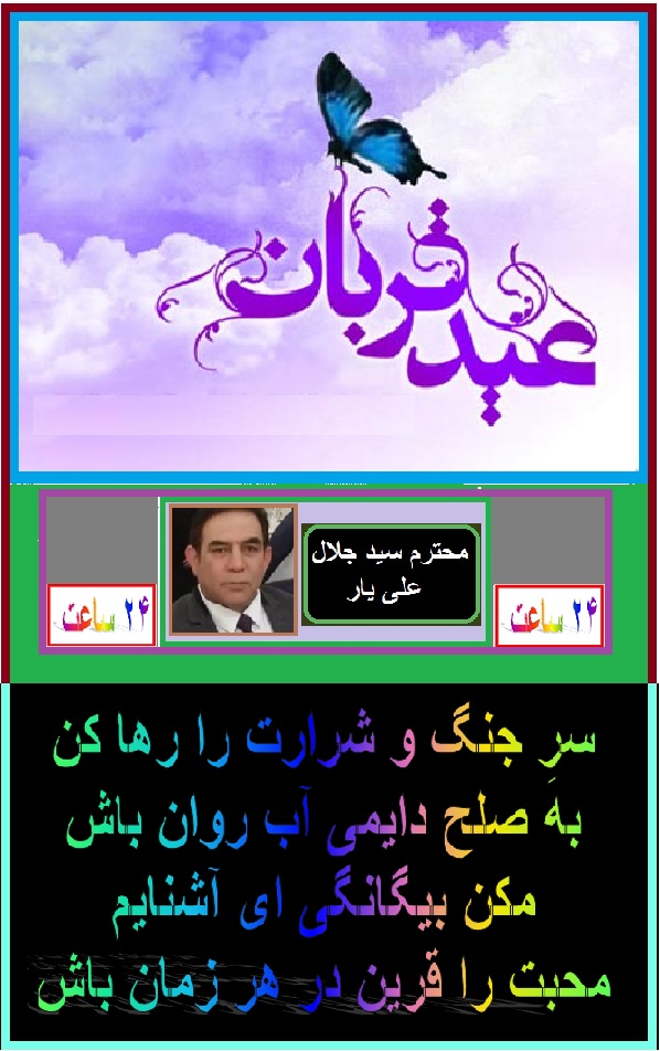 حلول عيد سعيد قربان را براي همه عزيزان ، دوستان وسروران عاليقدر از صميم قلب تبريك وتهنيت عرض نموده در پرتو اين روز خجسته صحت وعافيت براي همه شما از خداوند منان استدعا مينمايم که صلح و ثبات دایمی در وطن عزیز ما افغانستان برقرار گردد و مردم مظلوم ما در پرتوی نور درخشان صلح ، عدالت و آزادی زندگی خویشرا پیش ببرند.