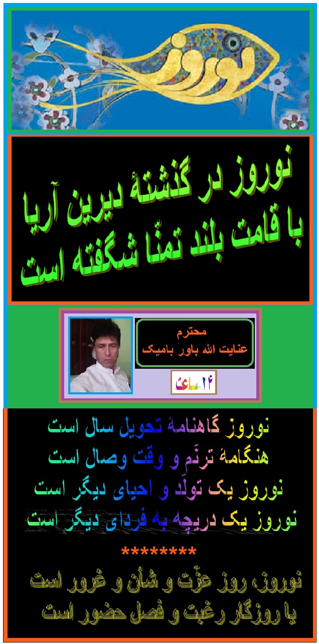 با تقدیم تازه ترین سروده ام سال 1397 خورشیدی و نوروز باستانی را به شما دوستان و عزیزان و خانواده های تان صمیمانه تبریک گفته و سال نو را یک سال صلح و آرامش و ترقی و تعالی برای کشور غمزدۀ ما آرزو مینمایم ایزد توانا برحال مردم بیچارۀ ما رحم کند، خداوند اتحاد و همدلی نصیب ما بگرداند (آمین)