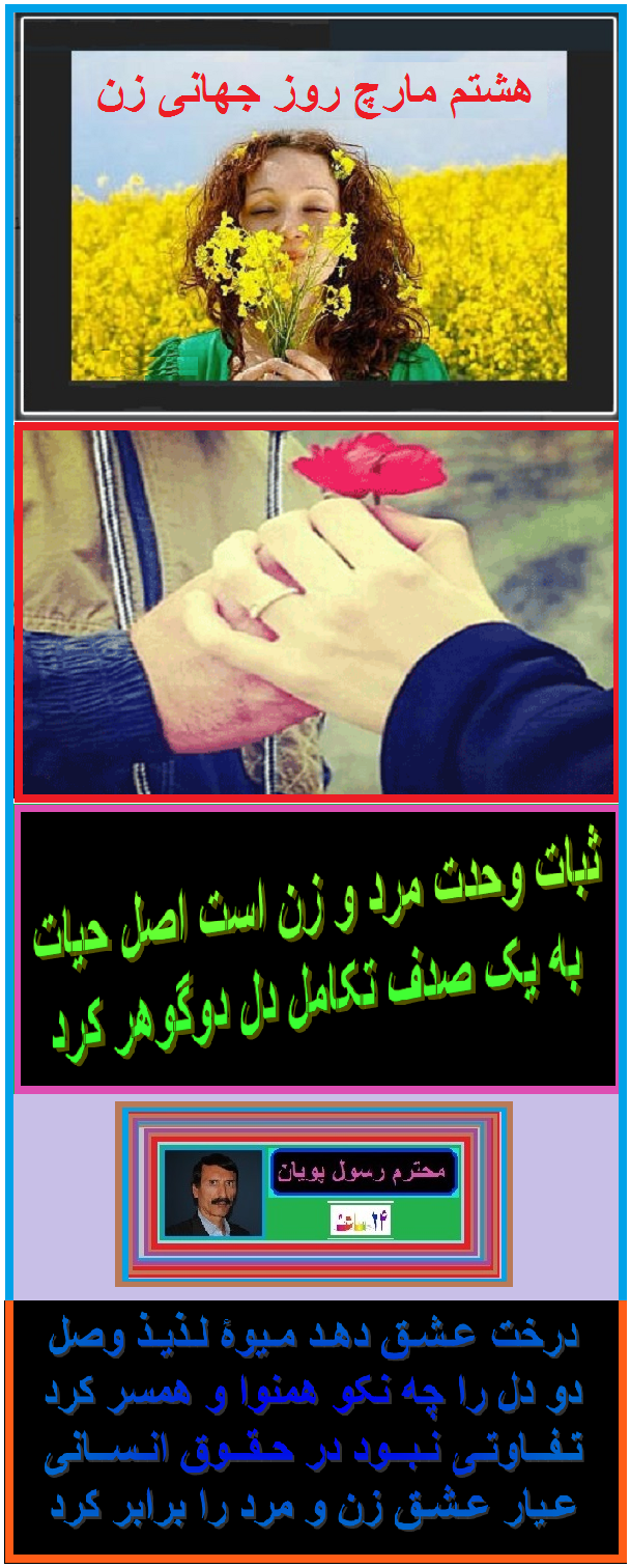 بمناسبت هشتم مارچ ۲۰۱۸ روز جهانی زن که فردا پنجشنبه است و نظر به مشکلات و ظیفوی و صحی چند مطلب را امروز چهارشنبه هفتم مارچ نشر نمودم و این روز را به تمام مادران و خواهران افغان و جهان تبریک عرض میکنم و امیدوارم که همیشه در کنار خانواده های خود زنده ، سلامت و بدون غم و پریشانی زندگی نمایند. و آنعده مادران و خواهرانیکه در این روز در جمع خانواده هایشان نیستند وبه رحمت حق پیوستند ، روحشان شاد و خلد برین جایشان.