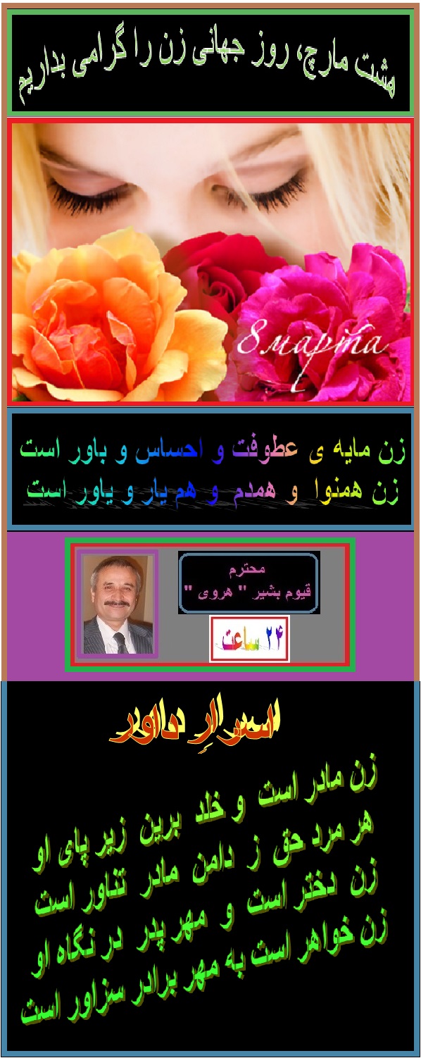 بمناسبت هشتم مارچ ۲۰۱۸ روز جهانی زن که فردا پنجشنبه است و نظر به مشکلات و ظیفوی وصحی چند مطلب را امروز چهارشنبه هفتم مارچ نشر نمودم و این روز را به تمام مادران و خواهران افغان و جهان تبریک عرض میکنم و امیدوارم که همیشه در کنار خانواده های خود زنده ، سلامت و بدون غم و پریشانی زندگی نمایند. و آنعده مادران و خواهرانیکه در این روز در جمع خانواده هایشان نیستند وبه رحمت حق پیوستند ، روحشان شاد و خلد برین جایشان.