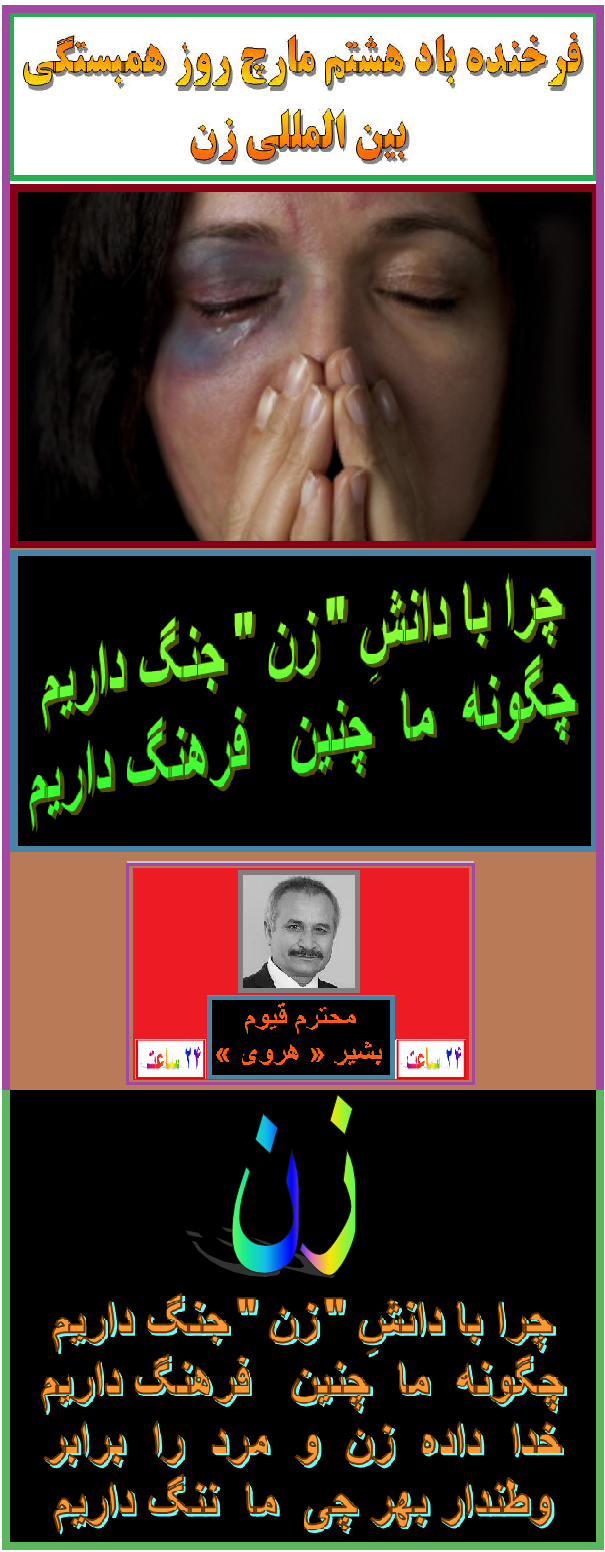 با تقدیم این سروده روز زن را به تمام زنان زحمتکش و با همت جهان بخصوص زنان ستمدیدۀ افغانستان تبریک گفته و آرزو دارم خشونت علیه زنان بکلی محو و نابود گردد و زنان غیرتمند در کنار مردان در ساختار یک جامعۀ نوین سهیم باشند.