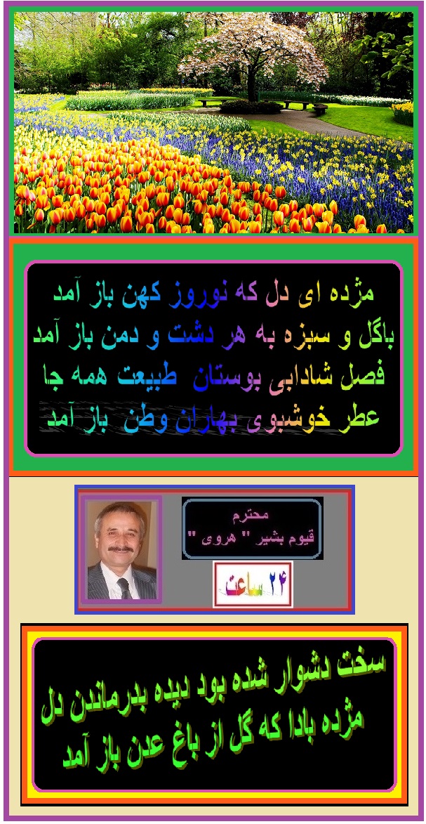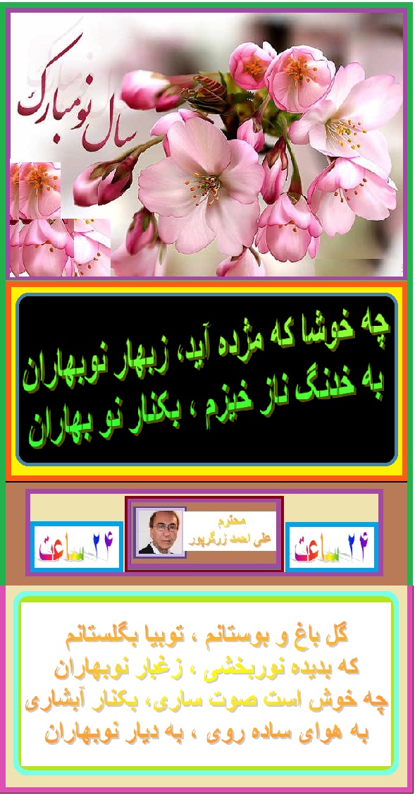 اولا سال نو ۱۳۹۸ خورشیدی و نوروز باستانی را بشما ، هموطنان گرامی ، خواننده گان محترم همکاران و دوستان عزیز فیسبوک ها ی آن و خانواده های محترمتان تقدیم میکنم . امیدوارم که سال نو در کشور ما یکسال مملو از صلح ، امنیت ، دوستی ، برادری ، بدون جنگ و خونریزی ، تفرقه ، تعصب و ترور باشد.