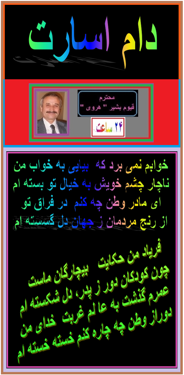 دام اسارت ، دامیست که بر اثر تعصبات کورکورانه لسانی ، قومی ، نژادی ، منطقوی ، مذهبی و در نهایت سلیقوی توسط دشمنان این مرز وبوم بوجود آمده و تعدادی از هموطنان ما نا خودآگاه درآن کشانیده شده اند . اگر بخود نیایند آنها را بسوی یک جنگ فرسایشی دیگر سوق خواهد داد. به امید اینکه عزیزان هموطن ما با آگاهی و بینش واقعگرایانه متوجه عواقب نا گوار این موضوع باشند و برای انسجام وهمآهنگی همگانی دست به دست هم دهند تا ازین دام وحشتناک رهایی جویند، به امید چنین روزی سعادتمندی هموطنانم را آرزومندم.