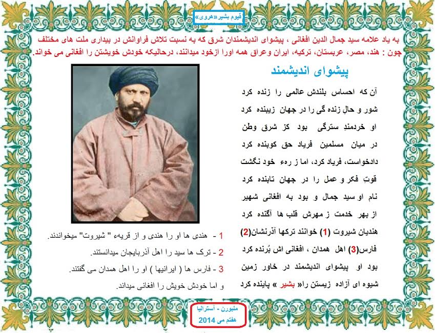 به یاد علامه سید جمال الدین افغانی ، پیشوای اندیشمندان شرق که به نسبت تلاش فراوانش در بیداری ملت های مختلف چون : هند ، مصر ، عربستان ، ترکیه ، ایران و عراق همه او را از خود میدانند ، در حالیکه خودش خویشتن را افغانی می خواند.