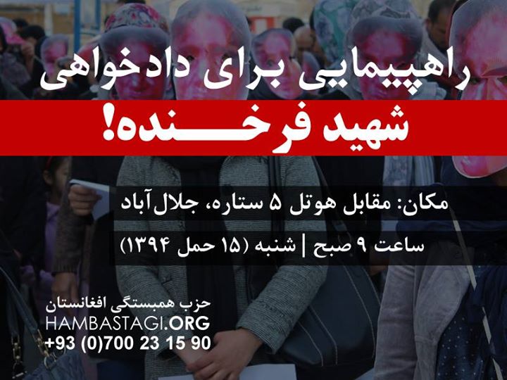 «حزب همبستگی افغانستان» راهپیماییای را در دفاع از خون شهید فرخنده برگزار مینماید.