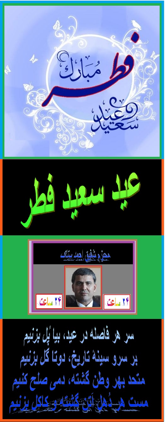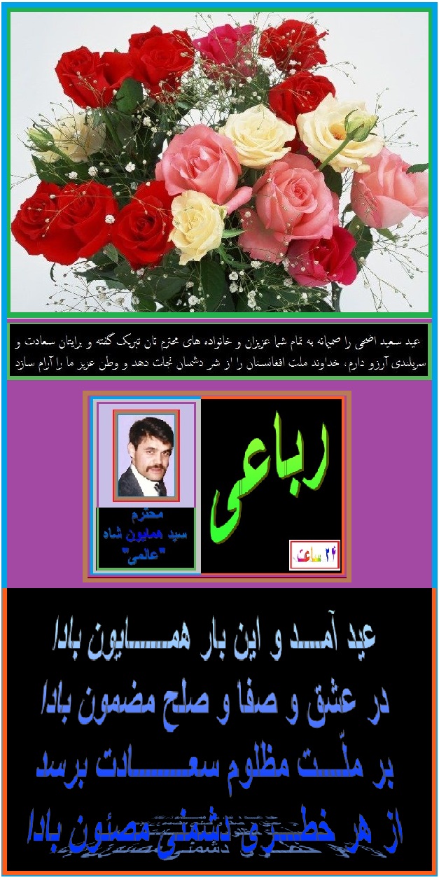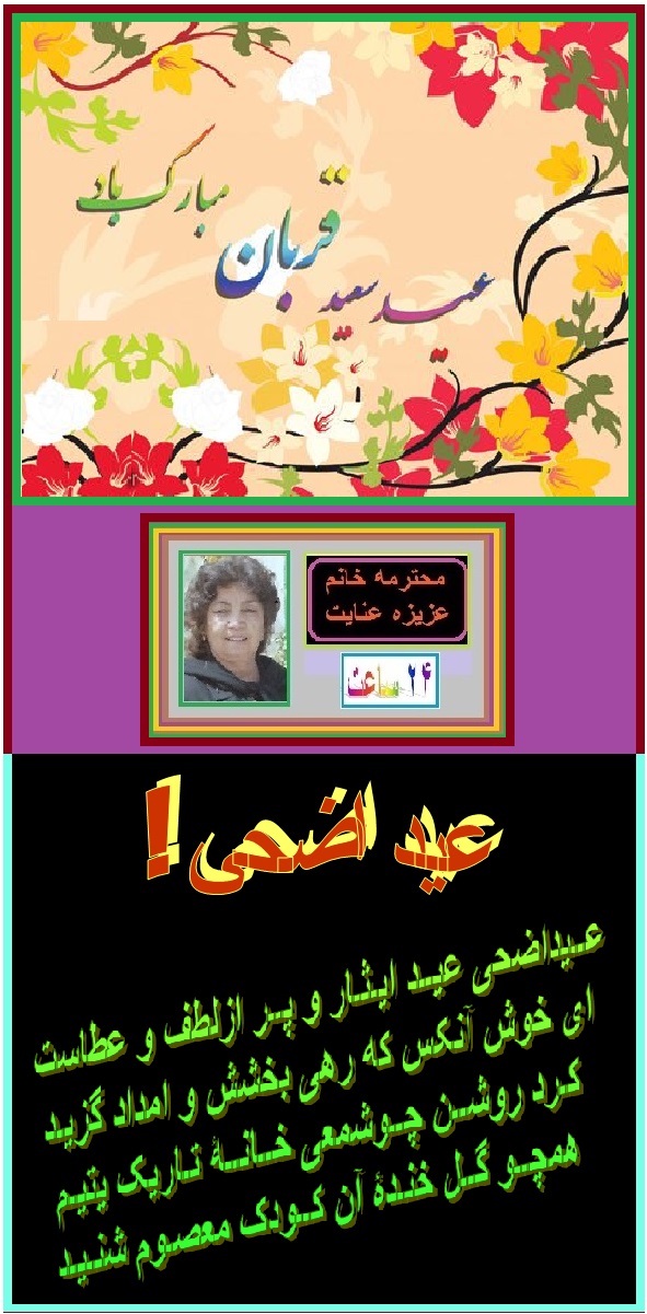 هموطنان عزیز ، همکاران و فرهنگیان گرامی ، خواننده گان محترم و دوستان فیسبوک ، ضمن عرض سلام و ادب روح شهدای عزیز ما که توسط جانی ها در چند ماه اخیر به شهادت رسیدند و یا زخمی شده اند شاد و خلد برین جایشان و به بازمانده گان شان که عید قربان امسال شان به عزا تبدیل شده است تسلیت عرض میکنم.