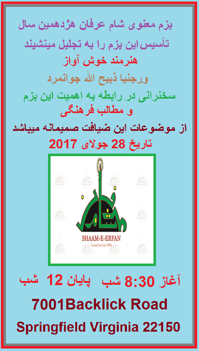 بتاریخ 28 جولای 2017 در ورجینیا محفل هژدهمین سال تاسیس بزم معنوی شام عرفان دایر میشود .
