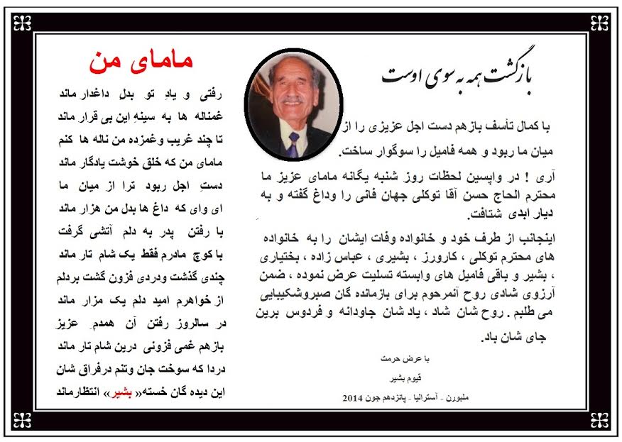 امروز پانزدهم ماه می 2014 مصادف است با هشتمین سالروز درگذشت مادر عزیز القدر و مهربان ما. از بارگاهء رب العزت شادی روح پاک آن مرحومه را تمنا نموده ، برای شان بهشت برین آرزو داشته و با عرض تسلیت مجدد برای تمام فامیل صبر و شکیبایی مسئلت داشته سلامتی و مؤفقیت همه را تمنا دارم.