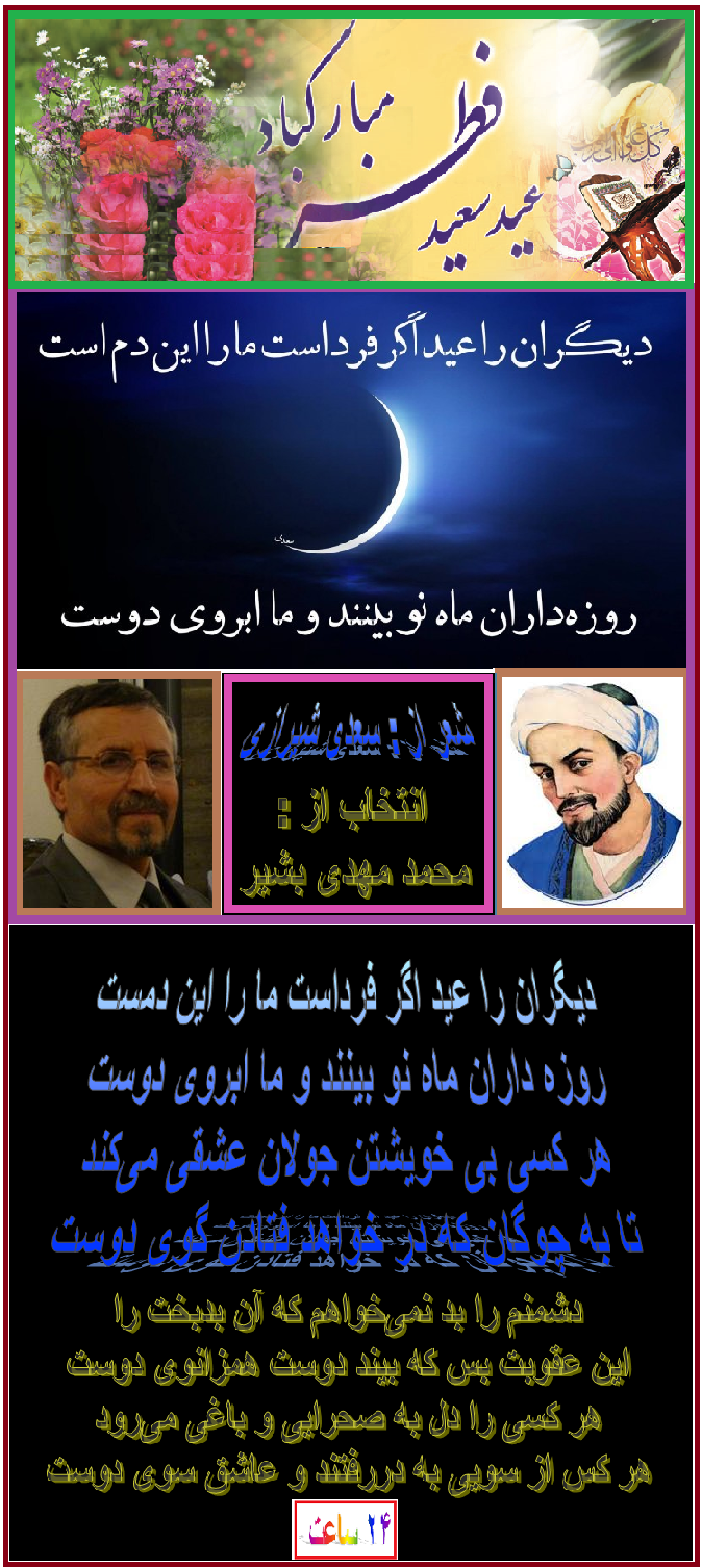 شعر زیبا و عالی را که سعدی شیرازی در باره عید سعید فطر سروده است انتخاب نموده و با شما عزیزان شریک ساختم و عید سعید فطر را برای همۀ دوستان گرامی تبریک عرض میکنم. امیدوارم که طاعات و عبادات تمام مسلمانان جهان قبول در گاه حق قرار گیرد. موفق وسلامت باشید و عید خوشی را سپری کنید.