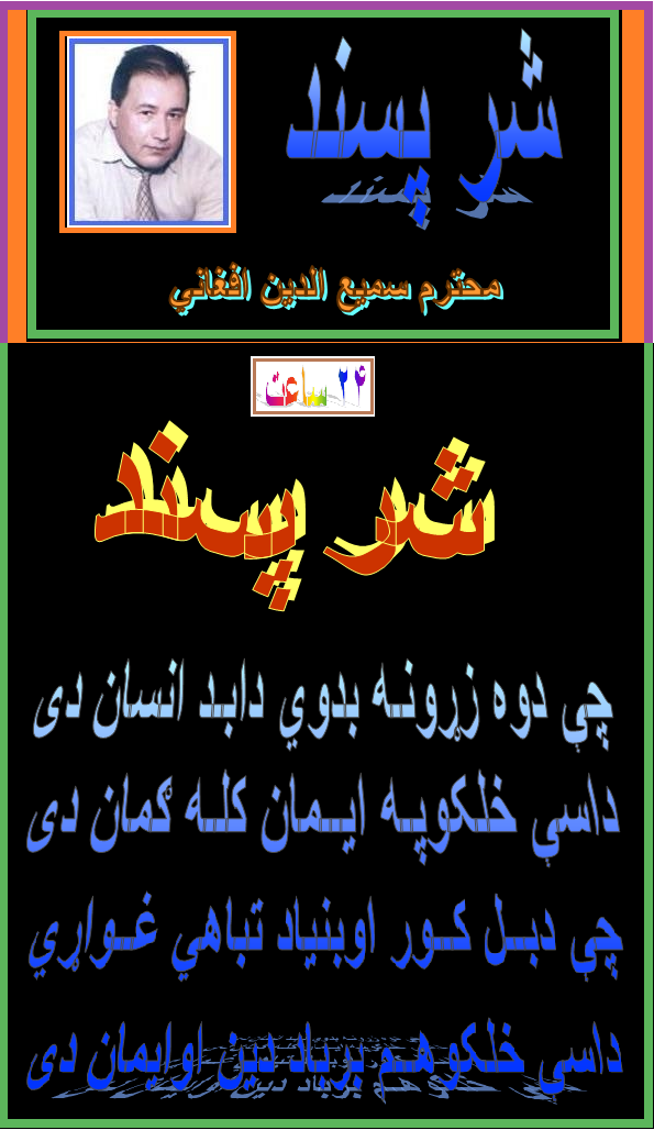 سروده ذیل را محترم سمیع الدین افغانی فرستاده اند. باید به عرض برسانم که تمام اقوام عزیز افغانستان از شمال تا جنوب و از شرق تا غرب هم از هزاره ، اوزبک ، پشتون ، تاجیک ، ترکمن ، نورستانی ، پشه ای و غیره در هر گوشۀ افغانستان و جهان که اند علاوه از زبانهای که در آن بلدیت دارند و در آنجا زندگی میکنند ، حق دارند که با هم با زبان مادری خود بدون هرنوغ تفرقه وتعصب صحبت نمایند و کسی اجازه ندارد که در مورد زبانشان عکس العمل نشان بدهد .
