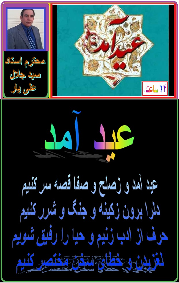 عید سعید فطر را به همه دوستان و سروران عالیقدر عزیزان و هموطنان در سراسرجهان تبریک و تهنیت عرض نموده امیدوارم با نفسهای تازه و عاری از گنه وبا صفا و صمیمیت عید ٬ گلِ آرزو ها و مدعای مان ازغنچه بدرآید و چون شگوفهٔ بهاری بشکفتن گیرد و گوهر امید ما در قعر توکل کشتی تدبیر مارا بر ساحل خوشبختی متمرکز سازد به امید صلح٬ آرامش و آزادی در سراسر افغانستان.