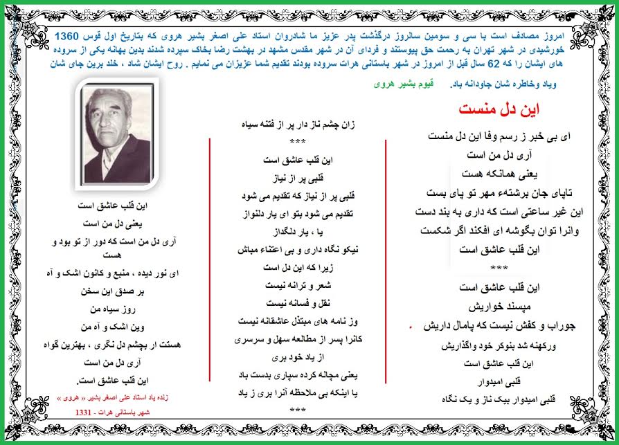 امروز مصادف است با سی و سومین سالروز درگذشت پدر عزیز ما شادروان استاد علی اصغر بشیر هروی که بتاریخ اول قوس 1360 خورشیدی در شهر تهران به رحمت حق پیوستند و فردای آن در شهر مقدس مشهد در بهشت رضا بخاک سپرده شدند بدین بهانه یکی از سروده های ایشان را که 62 سال قبل از امروز در شهر باستانی هرات سروده بودند تقدیم شماعزیزان می نمایم. روح ایشان شاد،خلد برین جای شان ویاد وخاطره شان جاودانه باد.
