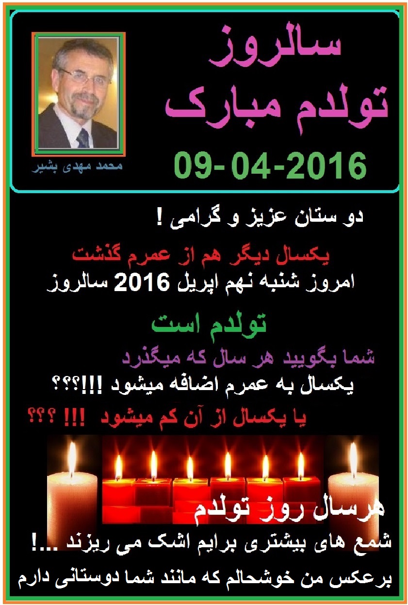 امروز شنبه نهم اپریل 2016 مصادف است به شصت و یکمین سالروز تولد بنده ، من این روز را بخودم تبریک میگویم و برای شما عزیزان صحت وسلامتی وخوشی آرزو میکنم.