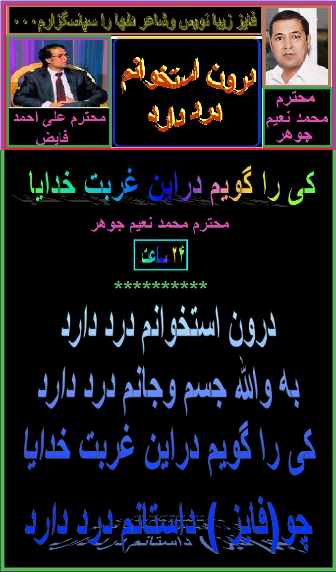 اخیرآ از طریق برادر محترم و گرامی جناب آقای محمد نعیم جوهر شاعر دلها اطلاع یافتم که برادر عزیز ، همکار گرامی سایت ۲۴ ساعت و شاعر جوان ما محمود جان امپراطور نامزد شده و شیریک زندگی برایش انتخاب نموده است ، من ازاین خبر زیاد خوش شدم و این پیوند زندگی شانرا به خودش ، عروس خانم و خانواده های هردوی شان از طرف خود و همکاران سایت ۲۴ ساعت و فیسبوک های شان تبریک عرض میکنم و برایشان خوشی ها ، صحت وسلامتی مملو از عمر طولانی آرزو میکنم.