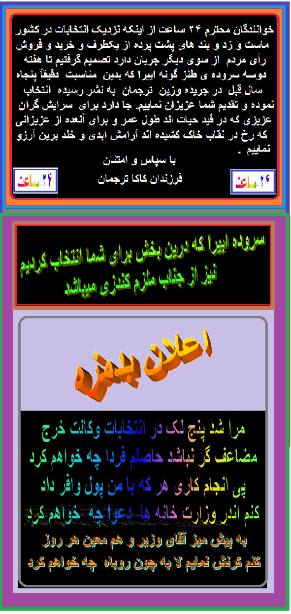 خوانندگان محترم ۲۴ ساعت از اینکه نزدیک انتخابات در کشور ماست و زد و بند های پشت پرده از یکطرف و خرید و فروش رأی مردم از سوی دیگر جریان دارد تصمیم گرفتیم تا هفته دوسه سروده ی طنز گونه اییرا که بدین مناسبت دقیقآ پنجاه سال قبل در جریده وزین ترجمان به نشر رسیده انتخاب نموده و تقدیم شما عزیزان نماییم. جا دارد برای سرایش گران ِ عزیزی که در قید حیات اند طول عمر و برای آنعده از عزیزانی که رخ در نقاب خاک کشیده اند آرامش ابدی و خلد برین آرزو نماییم.