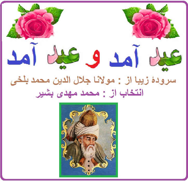 دوستان محترم و گرامی ، ضمن عرض سلام و ادب ، عید آمد و عید آمد سروده زیبا ست از مولانا جلال الدین محمد بلخی که یکی از شاعران مشهور زبان فارسی کشور ماست و آنرا انتخاب نموده و با شما شیریک ساختم .روحش شاد.