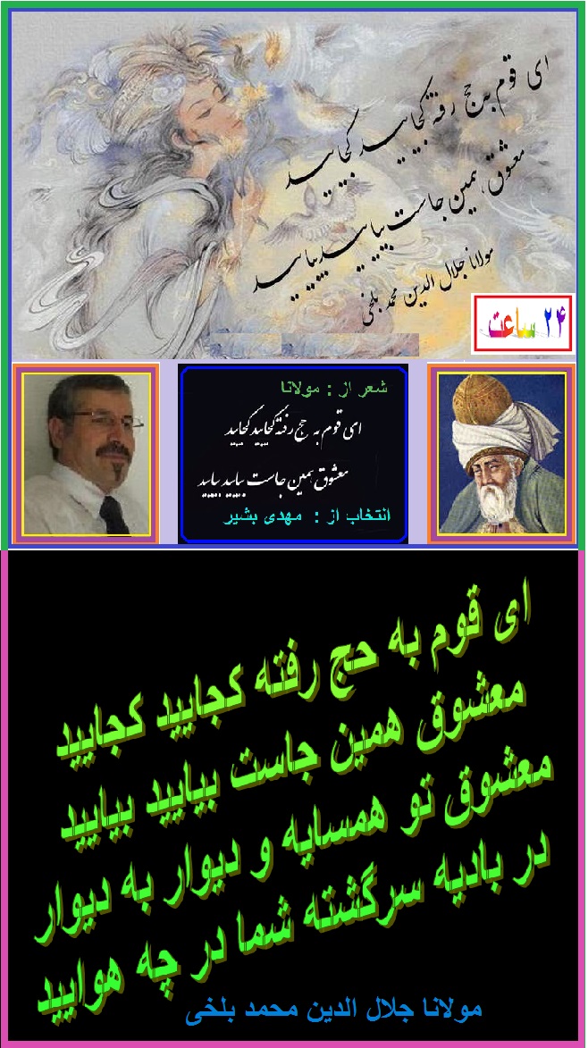 دوستان عزیز ، این سروده زیبا از حضرت مولانا جلال الدین محمد بلخی ( رح ) است که آنرا انتخاب نموده و با شما شریک ساختم .
