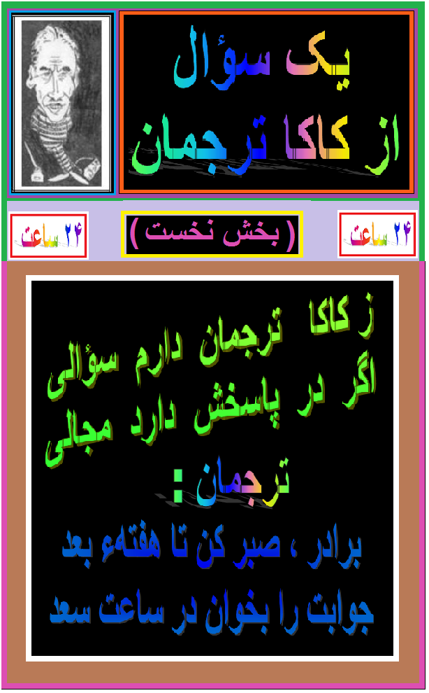 در این قسمت سؤالی را که توسط یکی از خوانندگان برون مرزی ترجمان از شهر مشهد مقدس کشور ایران از کاکا ترجمان پرسیده شده است به دست نشر می سپاریم و طبق روال گذشته پاسخ آنرا در هفته آینده تقدیم شما علاقمندان وخوانندگان گرانقدر خواهیم نمود.