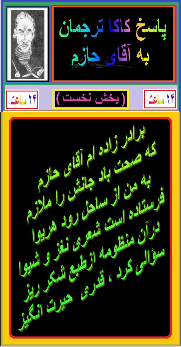 از آنجاییکه قبلا قول داده بودیم تا سؤال و جواب های کاکا ترجمان را به صورت سلسله وار نشر نماییم ،اینک نخستین سوال را که محترم حازم هروی از کاکا ترجمان پرسیده است تقدیم شما خوانندگان عزیز می نماییم و در هفته بعد به پاسخ آن می پردازیم ، امید مورد پسند تان واقع شود.
