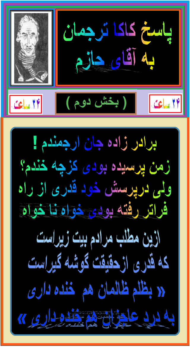 گرچه این آخرین بخش شوخی با دار و دستهء ترجمان میباشد که تقدیم شما خواننده گان عزیز می گردد ، اما ازهفتهء آینده کوشش میکنیم تا سوال و جواب کاکاترجمان و خواننده گانش را که هر چند گاهی اتفاق افتاده تقدیم حضور شما عزیزان نماییم