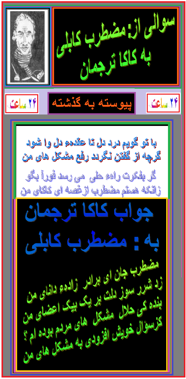 اینک طبق وعده قبلی سوال دیگری را که اینبار جناب مضطرب کابلی از کاکا ترجمان پرسیده اند همراه با پاسخ کاکاترجمان به ایشان را خدمت شما پیشکش مینماییم ، امید مورد پسند علاقمندان ترجمان قرار گیرد.