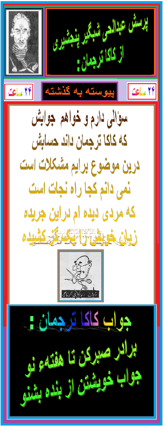 خوانندگان گرامی و علاقمندان ترجمان ! اینک توجه شما را به سوالی دیگری جلب میکنیم که محترم عبدالحی شبگیر پنجشیری از کاکا ترجمان پرسیده اند و پاسخ آنرا در هفته آینده تقدیم شما عزیزان می نماییم.