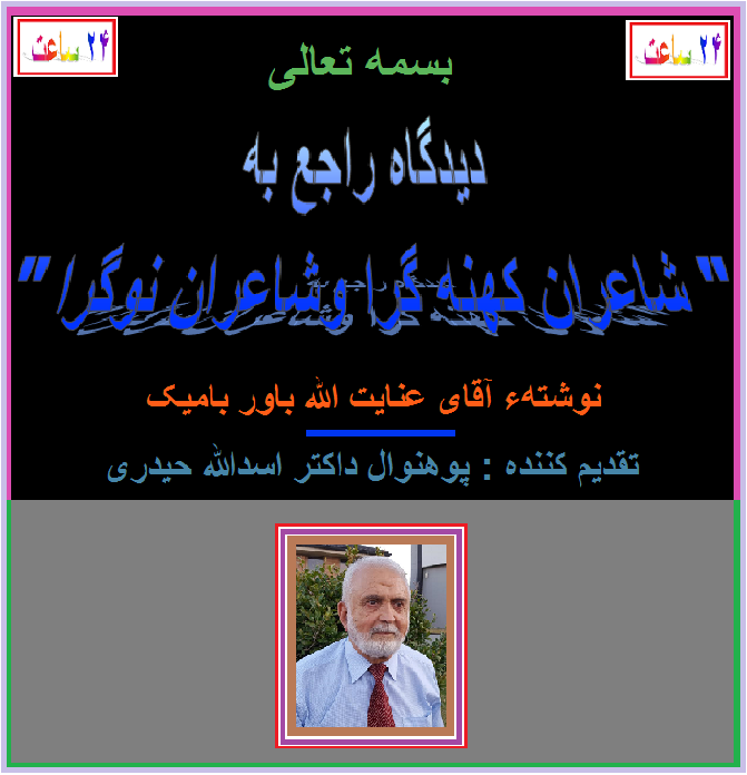 « تشکر از محترم استاد عنایت الله باور بامیک. شاعران عزیزیکه نظر و انتقادی داشته باشند میتوانند بنویسند. موفق وسلامت باشید. مهدی بشیر » موضوع خیلی جالب است ، از تمام شاعران عزیز و همکاران سایت ۲۴ ساعت میخواهم که حتمآ در باره این دیدګاه و آن نوشته نظریات ، انتقادات و پیشنهادات سالم خودرا با رعایت عفت کلام وقلم بنویسند . سایت ۲۴ ساعت در خدمت شان است .